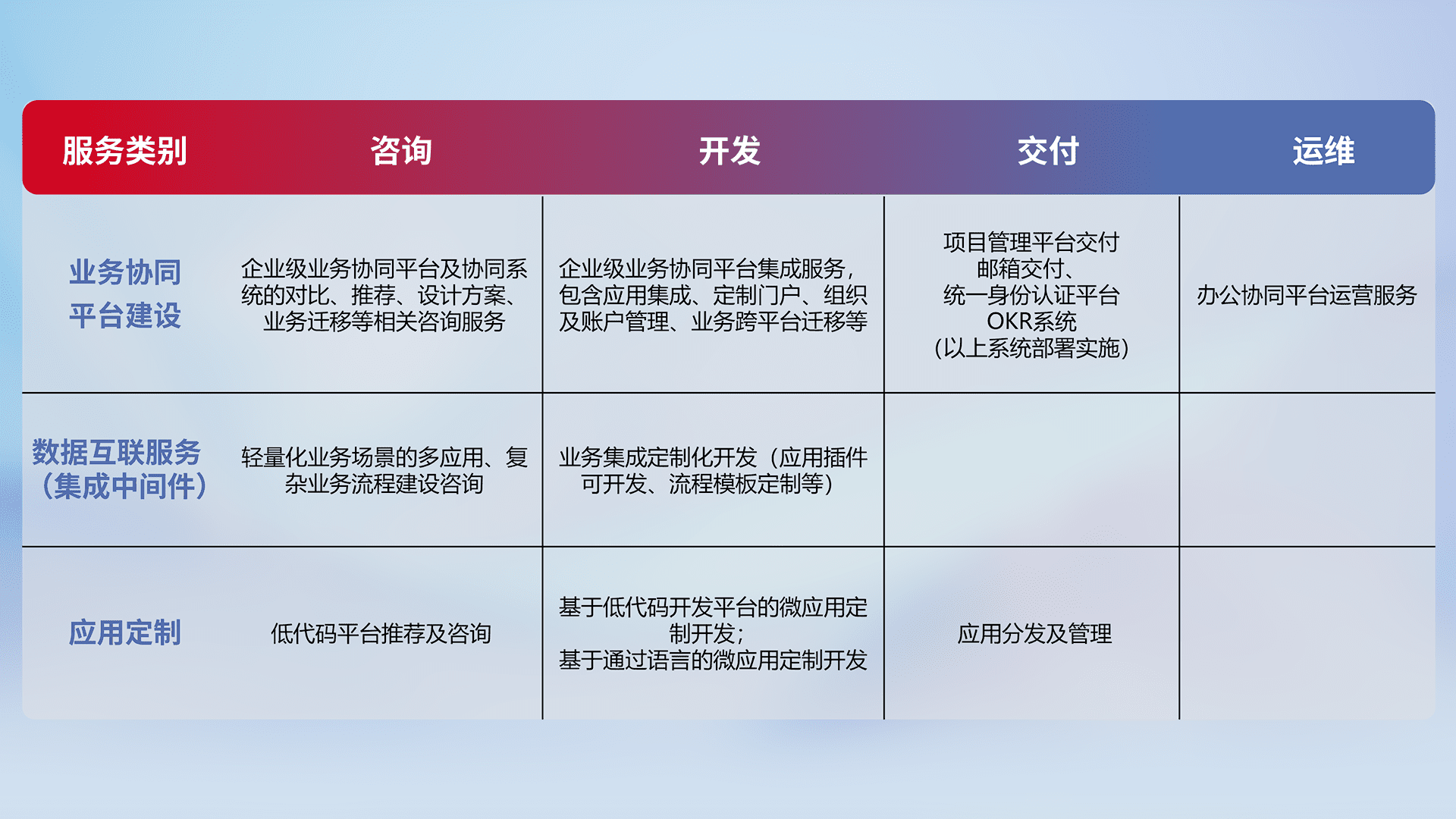 针对钉钉、、企微、、、IDaas等平台级产品提供产品的规划、、、、方案、、交付、、定制化开发等服务,,,实现如统一协同办公、、、智能客户服务、、混合会议管理、、、智能数据查询、、等业务场景,,,,实现数字化转型。。